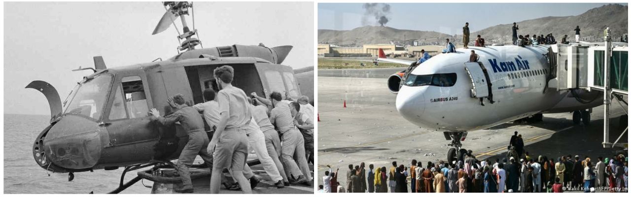 На першому фото – американці скидають в море власні гелікоптери, щоб врятувати декількох лояльних в'єтнамців і зберегти честь своєї країни. На другому залишки цієї честі відходять в історію.