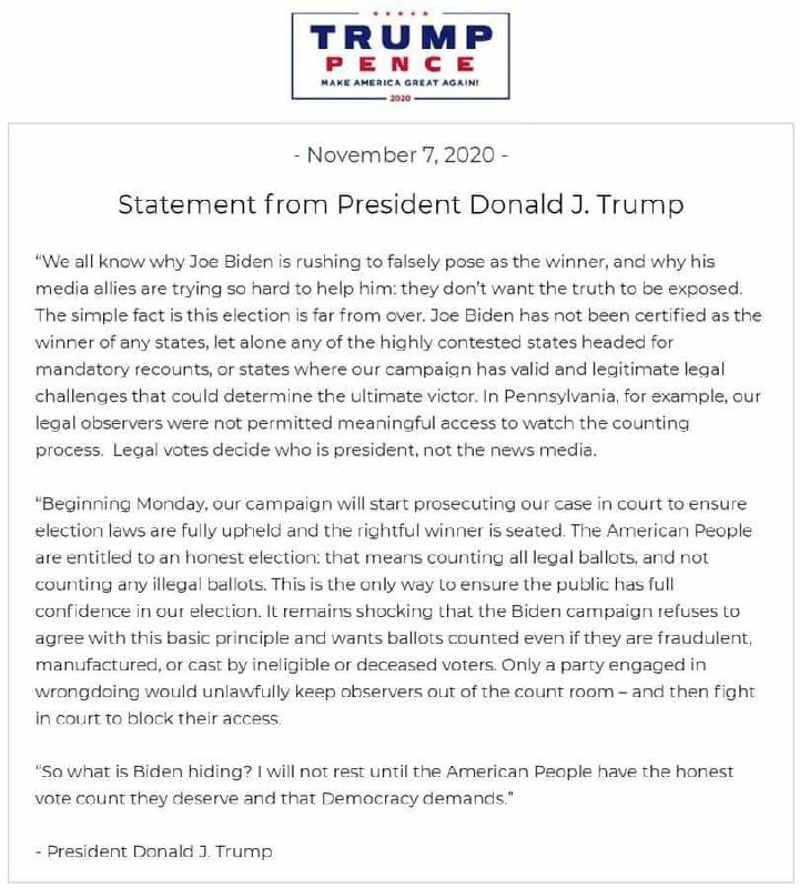 Простий факт: ці вибори ще далеко не завершені. Джо Байден не був визнаний переможцем ні в одному зі штатів, не кажучи вже про штати, в яких проводиться обов'язковий перерахунок голосів, або в штатах, де наша кампанія має дійсні і законні юридичні проблеми, які можуть визначити остаточного переможця.