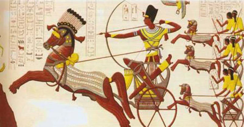 Особую египетскую силу приобрела армия после появления колесниц, которые египтяне позаимствовали у завоевавших их на время гиксосов. После освобождения от засилия гиксосов, египтяне модернизировали колесницу. В частности, в строительстве новых колесниц активно применялся металл, прочность которого позволила отказаться от сплошных массивов дерева и делать тонкие детали. Таким образом металлическая колесница оказалась легче и маневренней деревянной! Изобретение спиц позволило делать колёса бОльшего диаметра. Ослы были заменены на лошадей. Вооружением колесницы были лук и копьё. Часто на колеснице воевал сам фараон.