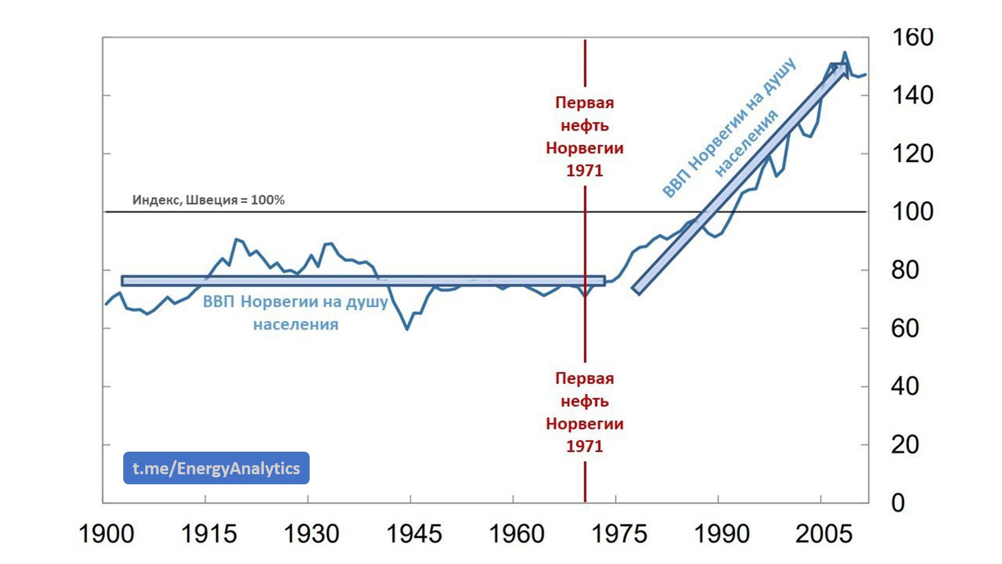 Норвегия 🇳🇴 и Швеция 🇸🇪 - близкие соседние страны со многими схожими экономическими, политическими и географическими характеристиками, за исключением наличия нефтяных ресурсов 🛢. Средний уровень доходов между двумя странами был стабильным до 1971 года, т.е. до того как Норвегия начала добывать свою первую нефть в Северном море. График (ниже) сравнивает Норвегию с синтетическим индексом Швеции и показывает около 20% годового роста 📈 ВВП на душу населения в Норвегии после первой добычи нефти в 1972 году.