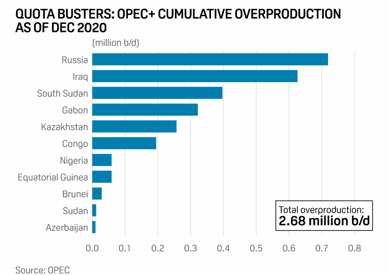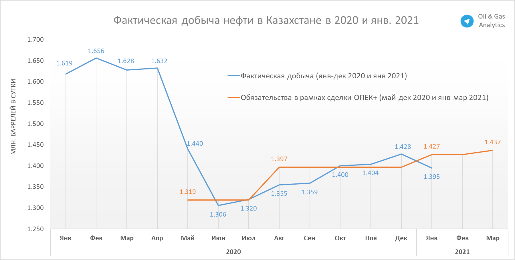 По итогам заседания стран-участницф соглашения ОПЕК+ 4-5 января было принято решение о продлении текущего уровня сокращения добычи нефти на февраль и март 2021 года. При этом для Казахстана и России были согласованы отдельные условия, предусматривающие поэтапное увеличение добычи в данный период на 10 и 65 тыс. б/с соответственно.