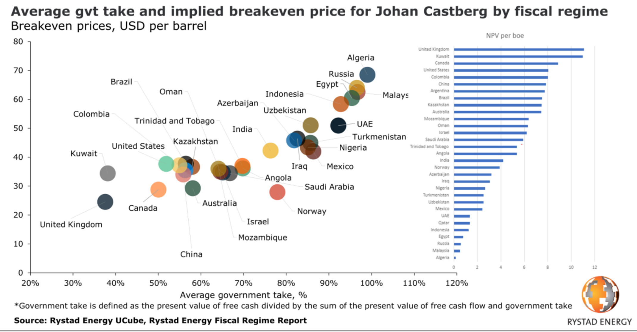 Согласно анализу, Казахстан имеет такие же налоговые режимы, как Китай, Бразилия и Австралия. Правительство получает 60% от свободных денежных средств (government take), безубыточная цена на нефть составляет $35 за баррель, а инвестор может получить чистую приведенную стоимость в $7,5 за бнэ. Тем не менее, при нынешних ценах на нефть Казахстану потребуются дополнительные возможности для конкуренции с другими странами в привлечении инвестиций в нефтегазовый сектор. © 2021 [Oil & Gas Analytics]