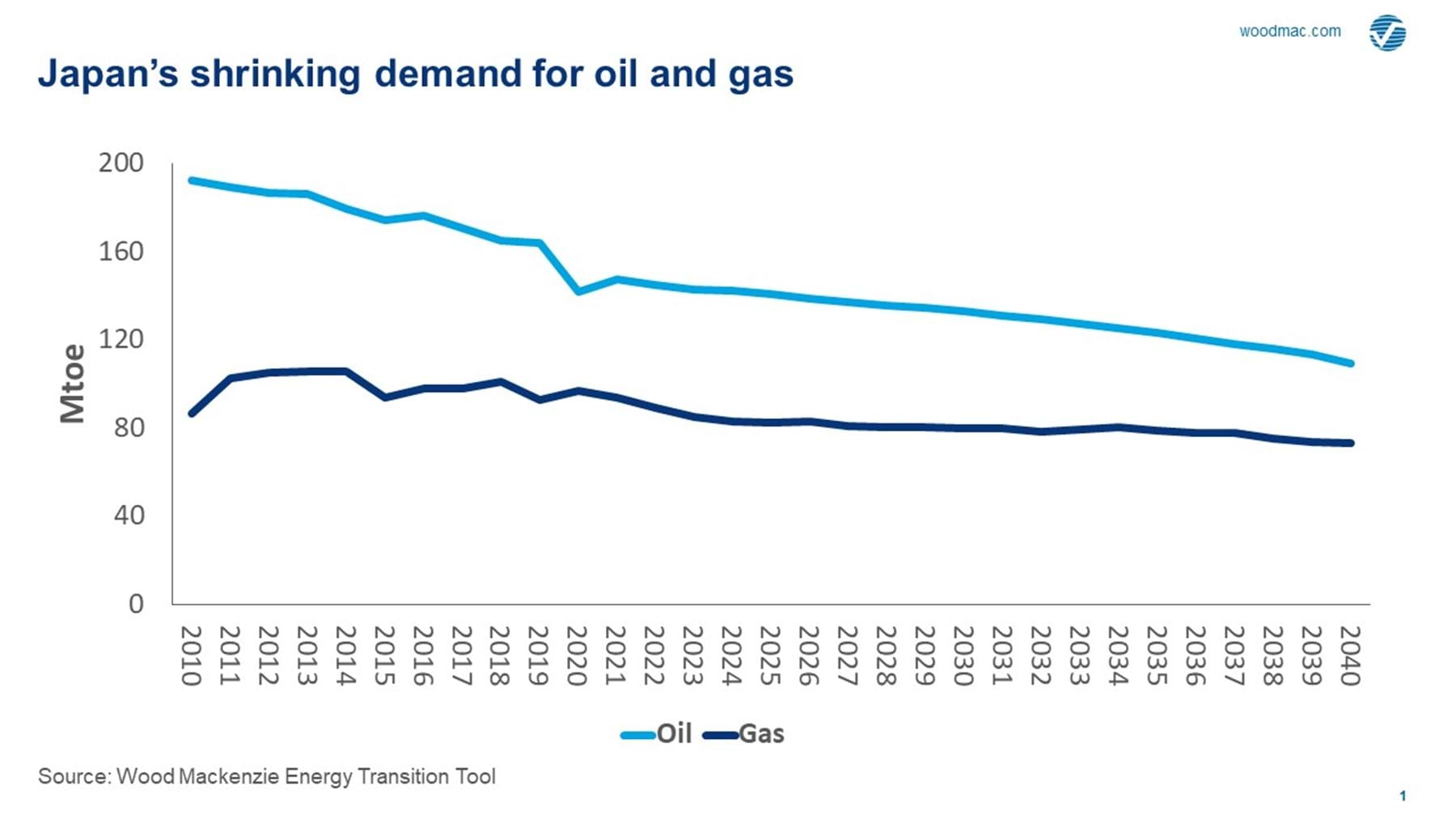 На графике WoodMac прогнозирует сокращение спроса на нефть и газ в Японии к 2040 году.