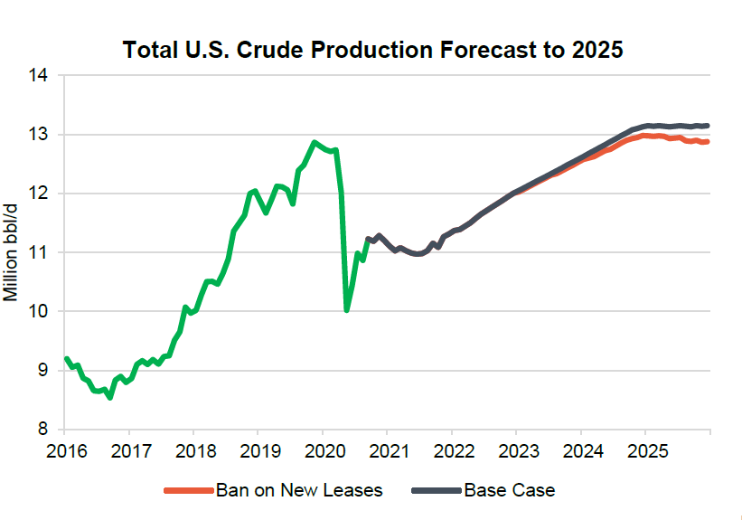 В соответствии с новым запретом, основанным на независимых оценках, добыча нефти начнет снижаться после 2025 года, и к 2030 году снизится на 0,5 млн баррелей в сутки (б/с). В крайнем варианте, где если все новые бурение будут запрещены, добыча начнется снижаться с 2021 года и приведет к сокращению в Мексиканском заливе на 1,6 млн б/с к 2030 году.