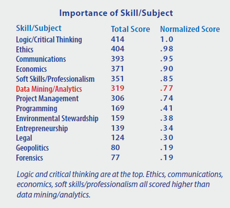 На графике ниже вы можете найти набор навыков с оценкой важности. Наивысшая потребность - это логика и критическое мышление, за которыми следуют этика и навыки общения. Затем идет экономика и профессиональные навыки (soft skills) - неотъемлемая часть сегодняшнего инженера-нефтяника. Дальше аналитика больших данных (Big Data) и так далее.
