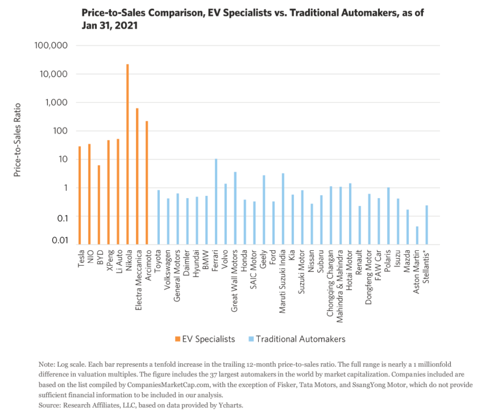 Рост рыночной стоимости, естественно, приводит к астрономически высоким оценочным показателям. Из-за огромного отношения цены к продажам новых производителей электромобилей используется логарифмическая шкала. Например, Tesla оценивается в 28 раз по сравнению с ее продажами в 2020 году - это намного больше по сравнению со средней ценой / продажей 1,1 у традиционных автопроизводителей.