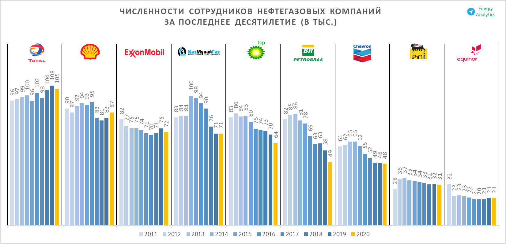 После публикации о добытых баррелях на одного сотрудника нефтегазовых компаний, решил поделиться данными об изменении количества сотрудников за последнее десятилетие.