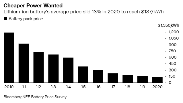По данным BloombergNEF, цена на литий-ионные батареи в 2020 году в среднем составила $137/кВт.ч по сравнению с более чем $1000/кВт.ч 10 лет назад. Ожидается, что электромобили достигнут ценового паритета с автомобилями с двигателями внутреннего сгорания, когда стоимость аккумуляторов снизится до $100/кВт.ч.
