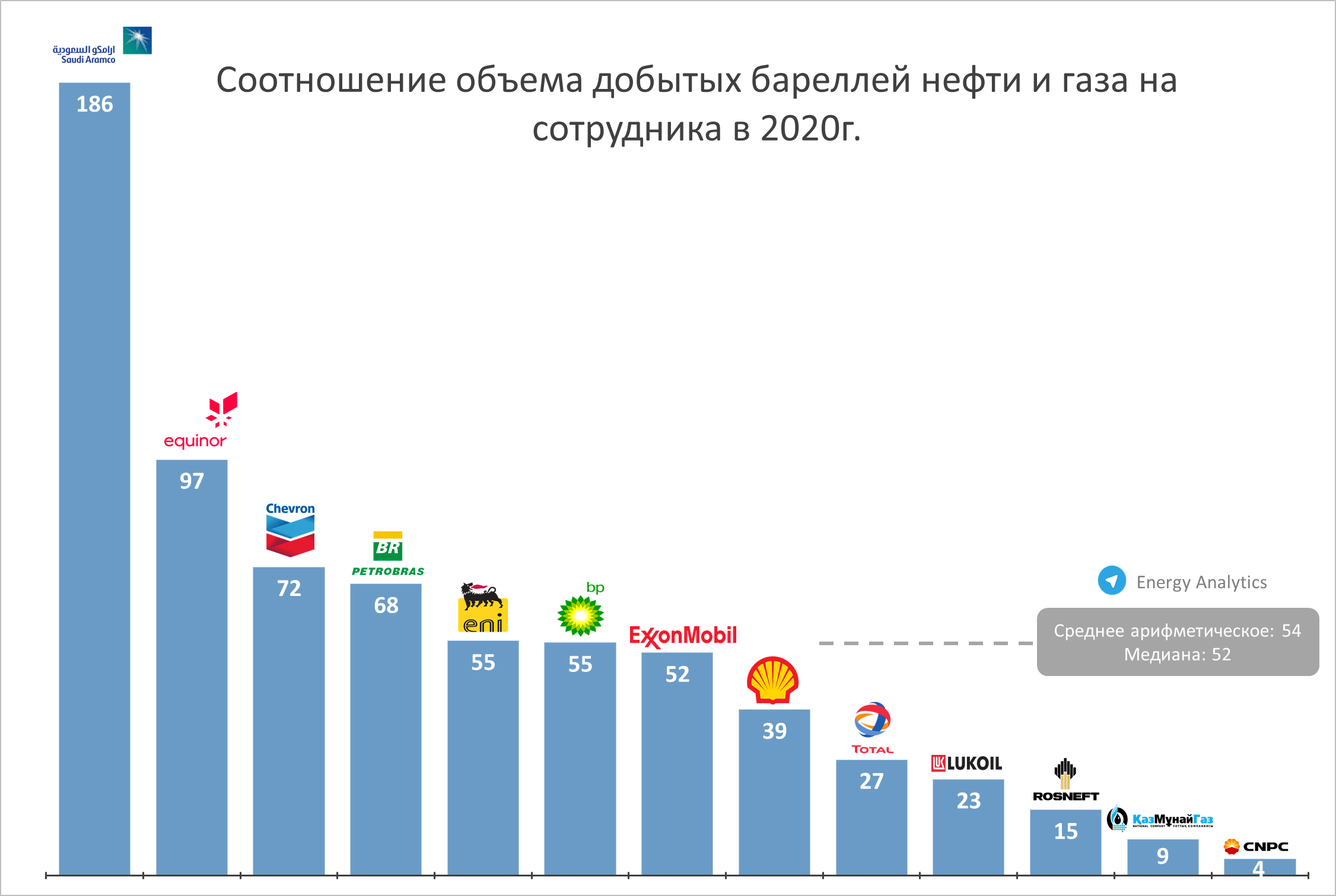 Сравнение соотношения количества добытых бареллей на сотрудника в нефтегазовых компаниях.