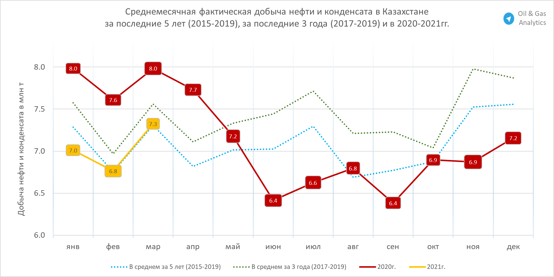 В результате мы видим на инфографике, что добыча нефти и конденсата в Казахстане за предыдущий месяц вернулась к среднему уровню за 5 лет.