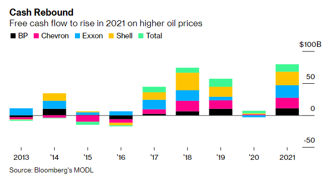 Данные компании и оценки, составленные Bloomberg, показывают, что свободный денежный поток для пяти крупнейших компаний (BP, Chevron, ExxonMobil, Shell,Total) в этом году должен вырасти до $80 млрд по сравнению с примерно $4 млрд в 2020 году.