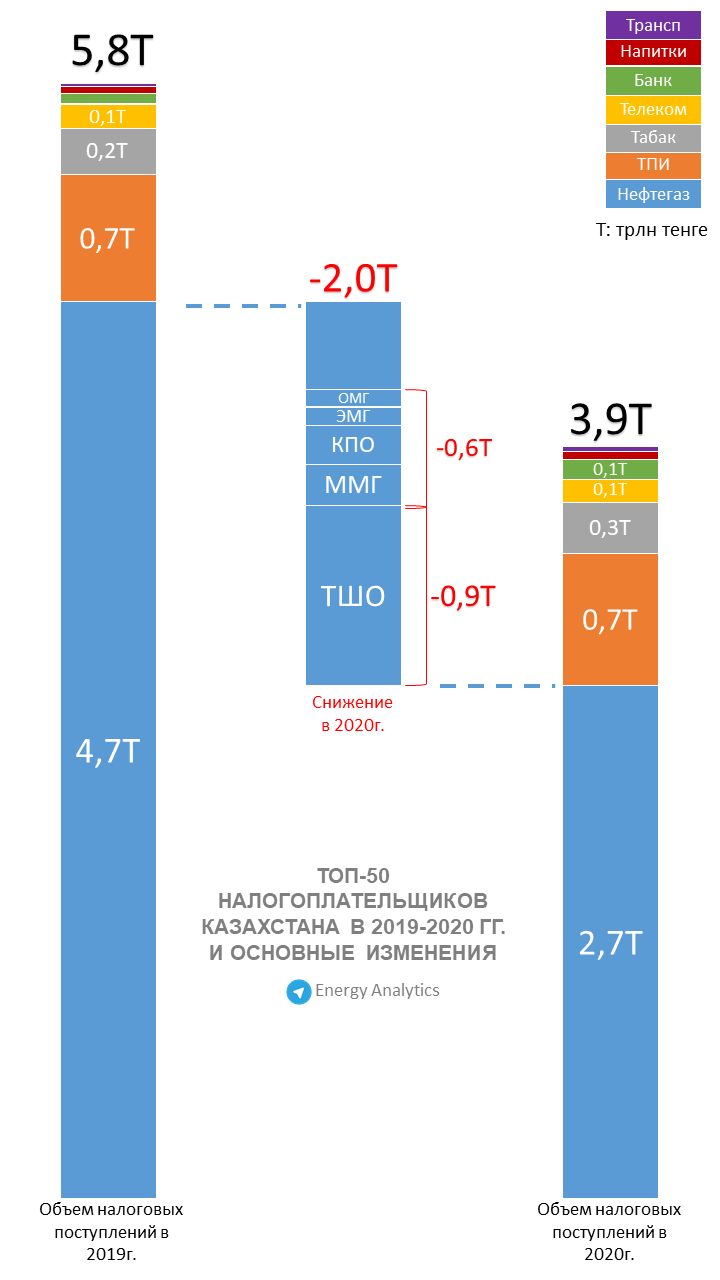 1. Снижение налоговых платежей на 1,9 трлн тенге в 2020 году исходит от нефтегазовых компаний (минус 2,0 трлн тенге) плюс увеличение платежей от табачных компаний на 0,1 трлн тенге.