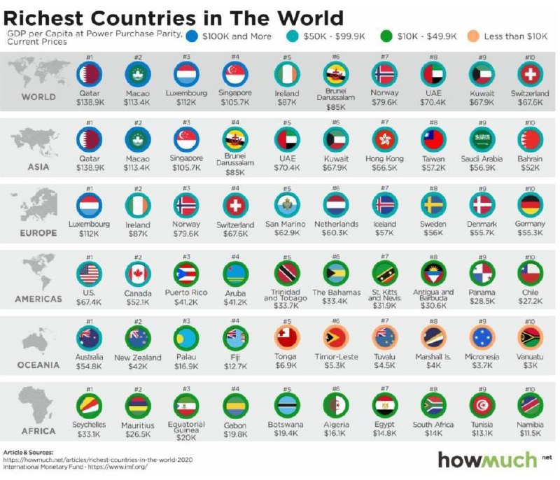 Внизу, инфографика основана на данных МВФ о показателях ВВП на душу населения по паритету покупательной способности (ППС). Визуализация разбивает данные по странам, регионам и материкам.