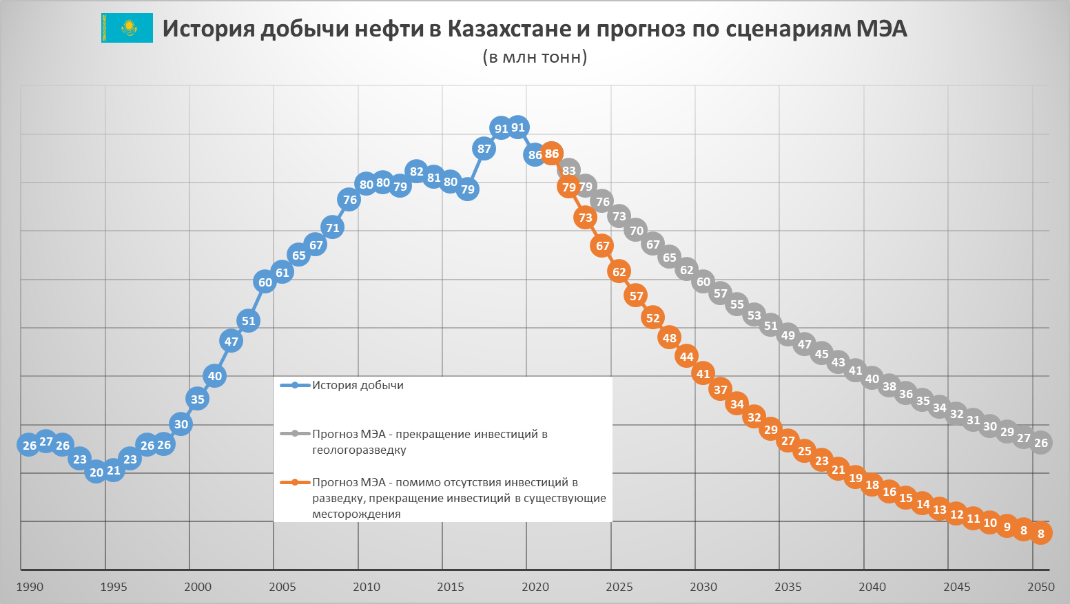 Чтобы дать представление, это означает, что запланированная добыча нефти в Казахстане на 2021 год в размере 86 млн тонн должна снизиться на 30% (60 млн тонн) к 2030 году и на 70% (26 млн тонн) к 2050 году! В случае отсутствия инвестиций в существующие месторождения, помимо вышеперечисленного, оно сократится вдвое быстрее: 40 млн т к 2030 году и 8 млн т к 2050 году. И все это сделано ради достижения климатических целей, чистые выбросы CO2 к 2050 году.