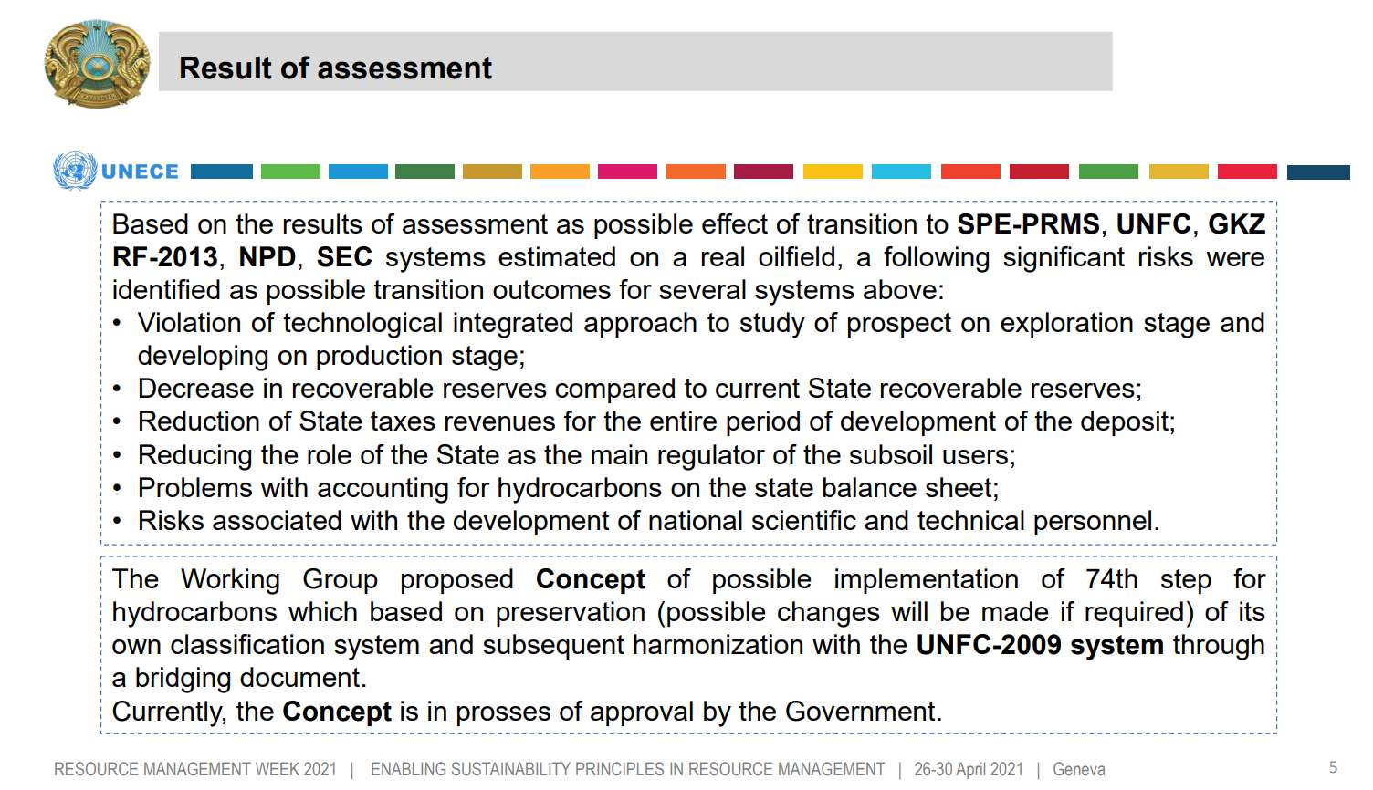 С тех пор прошло 7 лет, а официального принятия международной системы в нефтегазовом секторе Казахстана не произошло. Исключением может быть недавняя презентация, выпущенная в рамках недели управления ресурсами ЕЭК ООН в апреле 2021 года.
