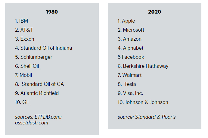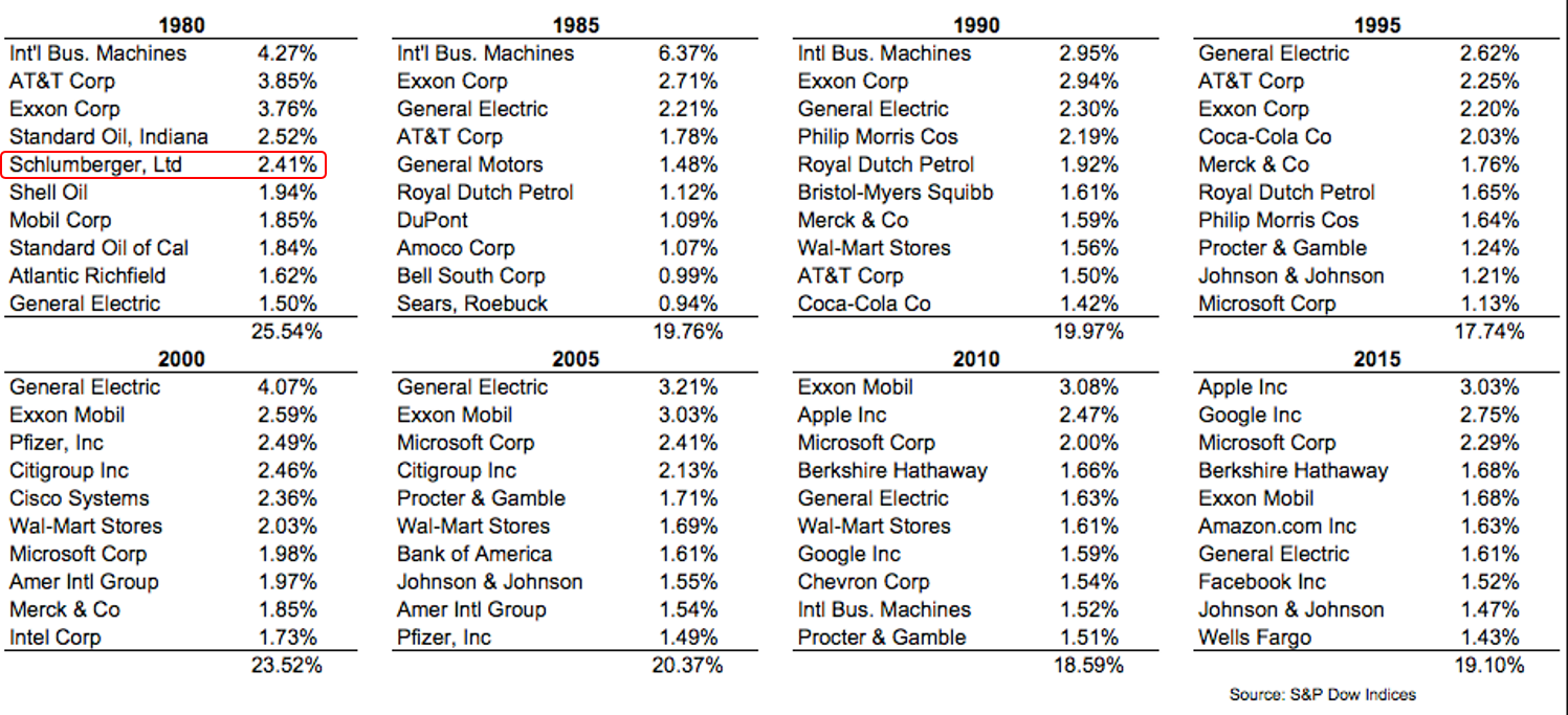 Сегодня рынок торгуется по цене более чем в четыре раза превышающей балансовую стоимость и более чем в 30 раз превышающей его прибыль. Доходность индекса Доу-Джонса составляет всего 1,7%. В 1980 году Schlumberger была 4-ой по величине компанией с рыночной капитализацией $25 млрд. Сегодняшняя 4-ая по величине компания - Amazon, ее оценка сейчас в ~$1,7 трлн, что в 70 раз больше, чем у Schlumberger в 1980 году.