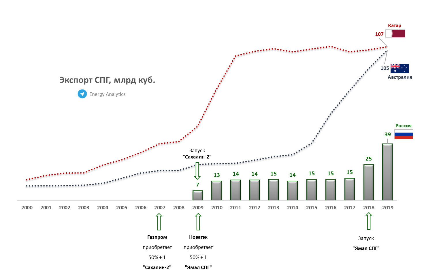 В результате спора консорциум проекта согласился продать «Газпрому» 50% + 1 акцию в 2007 году. Проект «Сахалин-2» стартовал в 2009 году с ввода в эксплуатацию двух линий СПГ. В том же году Новатэк приобрел Ямал СПГ и сдал его в эксплуатацию в 2018-2019 годах.