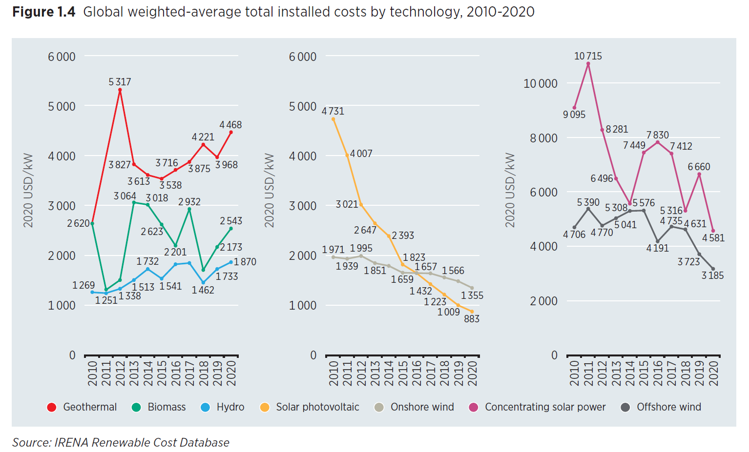 Анализ отчета также утверждает, что солнечная и ветровая энергия без финансовой поддержки теперь в том же диапазоне затрат для новых мощностей, работающих на ископаемом топливе. Наибольшее сокращение затрат произошло в установке солнечных панелей на 85% в период с 2010 по 2020 год.