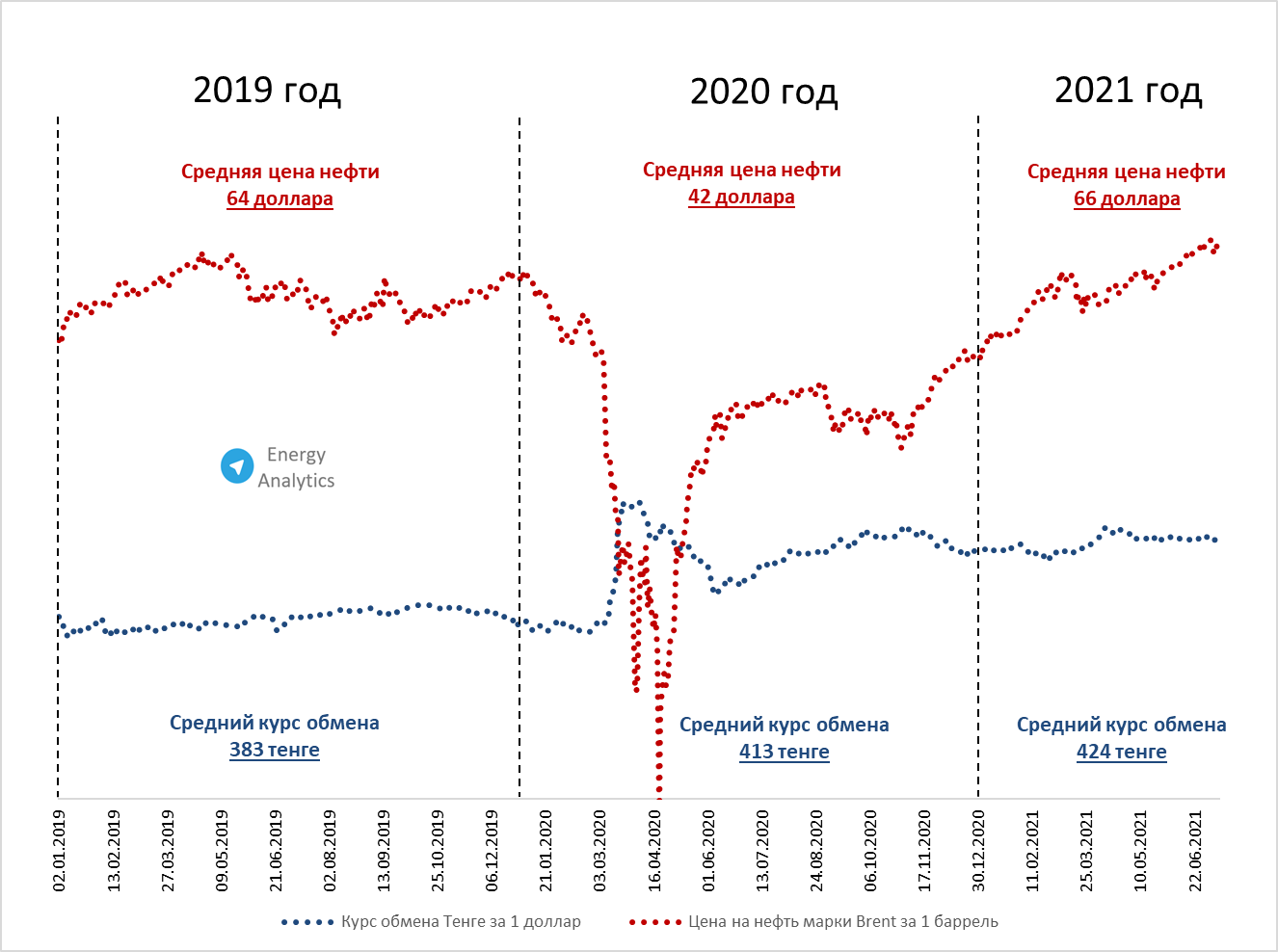 Средняя цена на нефть марки Brent с начала года составляет 66 долларов за баррель по сегодняшний день на дату 12 июля 2021 г. В тот же период времени обменный курс в среднем составил 424 тенге за 1 доллар США.