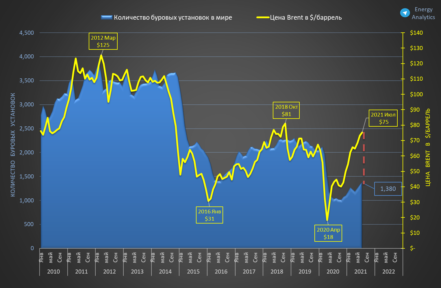 Средняя цена Brent на июль 2021 года составляет 75$ за баррель. Количество активных буровых установок в мире 1,380 единиц. За год цена на нефть увеличилась на 74%, вместе с тем количество буровых установок увеличилось лишь на 34%. С января 2021г цена подскочили на 50%, количество активных буровых установок на 25%.