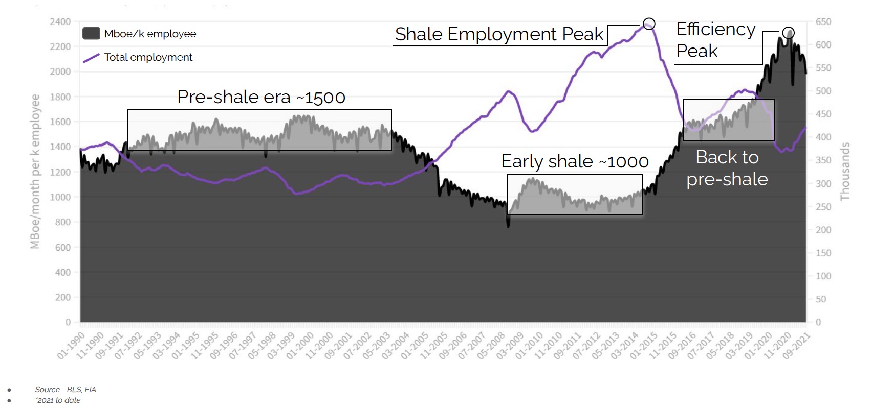 На приведенном ниже графике темные столбцы показывают добычу нефти и газа в США на одного сотрудника, а фиолетовая линия показывает общее количество сотрудников в США в разведке, добыче и нефтесервисе за последние 30 лет.