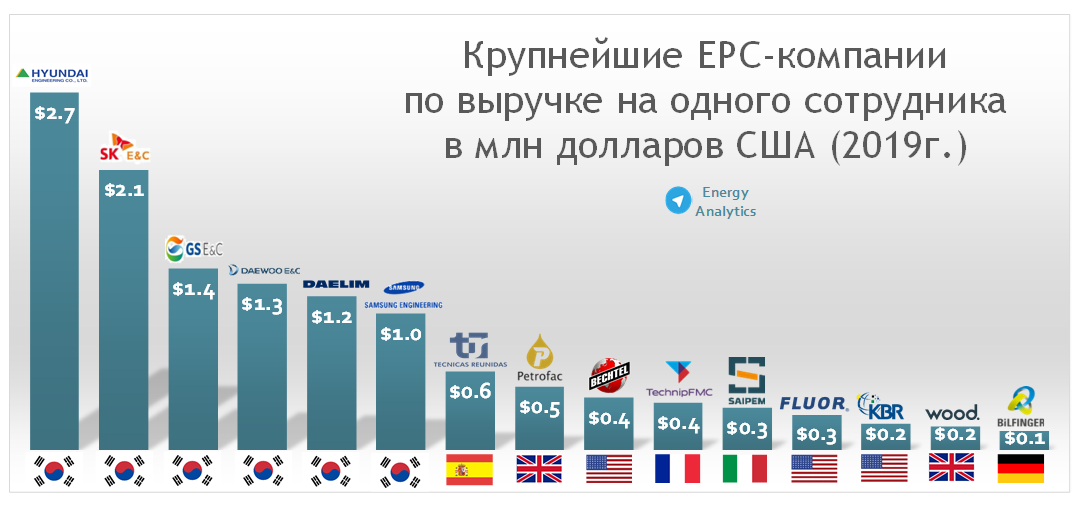 Решил составить список крупнейших EPC-компаний в мире. Оценил каждого EPC-игрока по их выручкам за 2019 год, разделенным на количество их сотрудников.