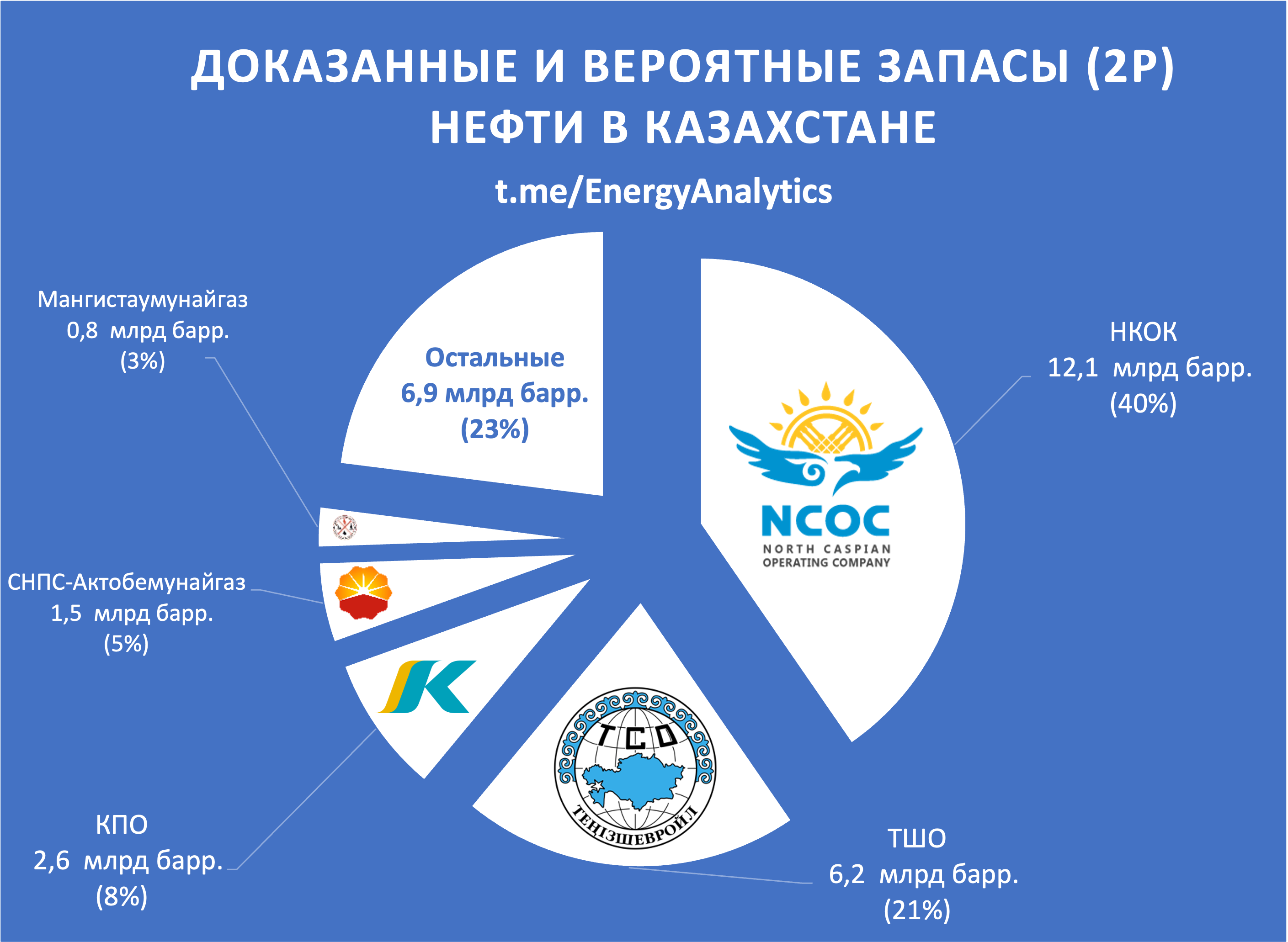 Согласно Национальному энергетическому докладу KAZENERGY за 2015 г., распределение запасов 30 млрд барр. по недропользователям выглядит следующим образом: