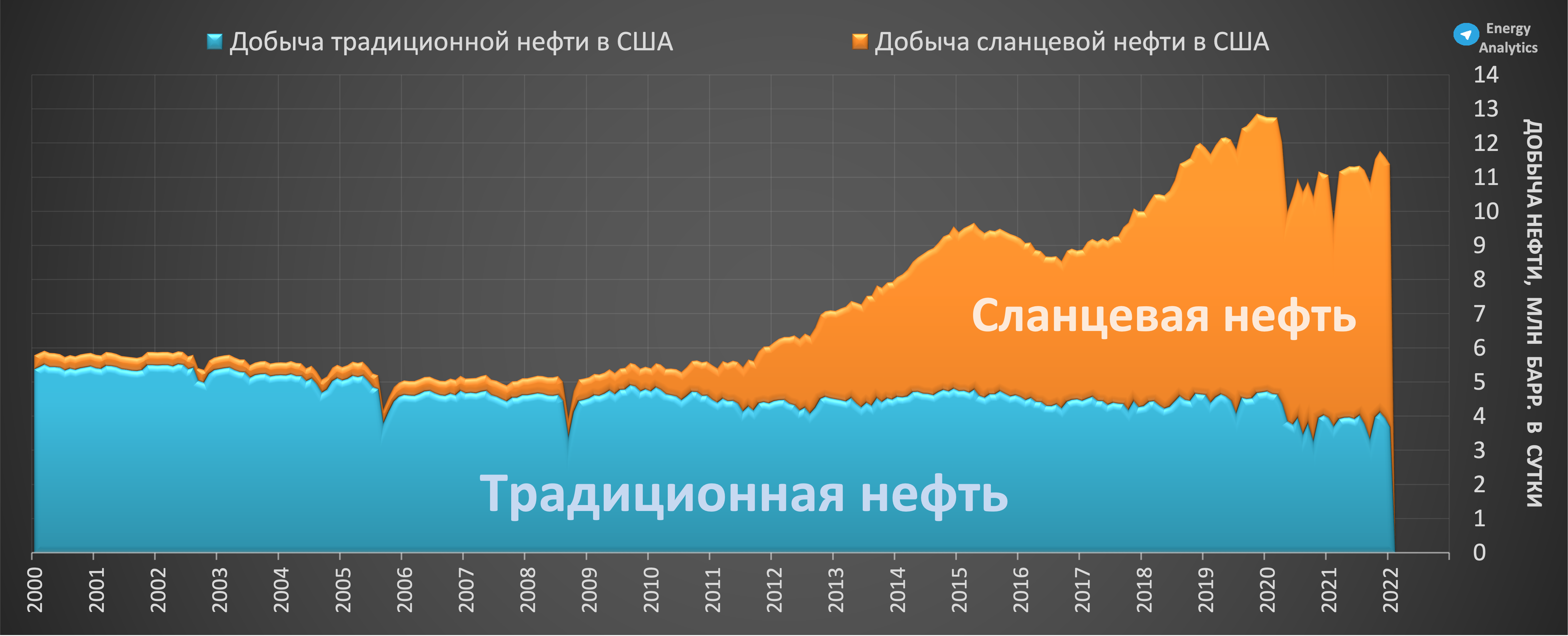 • Мы можем датировать бум добычи сланцевой нефти в США 2008 годом. С этого времени вплоть до текущей даты доля добычи сланцевой нефти увеличилась 7 раз, с 10% до 70% по сравнению с традиционной нефтью. Примечателен тот факт, что мировая цена на ресурс меньше на повлияла на этот растущий тренд.