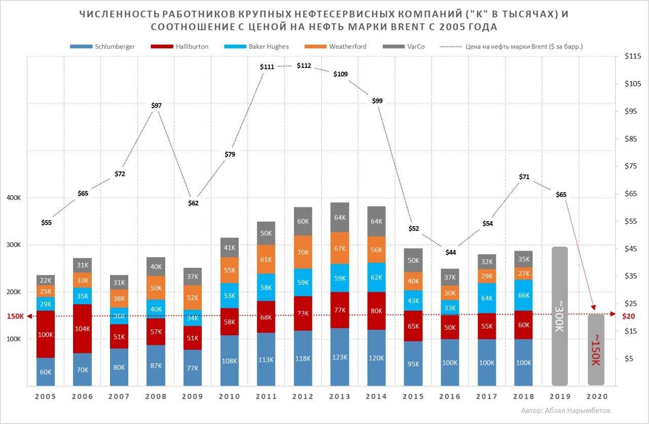 В моем предыдущем мини-исследовании была простая корреляция между общим количеством нефтесервисных компаний и ценами на нефть за последние 15 лет. Я взял Большую четверку (Schlumberger, Halliburton, Baker Hughes, Weatherford) и добавил Varco. По предварительным данным, если к концу года средняя цена на нефть останется на уровне $20/барр., половина рабочей силы в нефтесервисном бизнесе сократится. В день публикации спотовая цена на нефть марки Brent составила $15/барр.