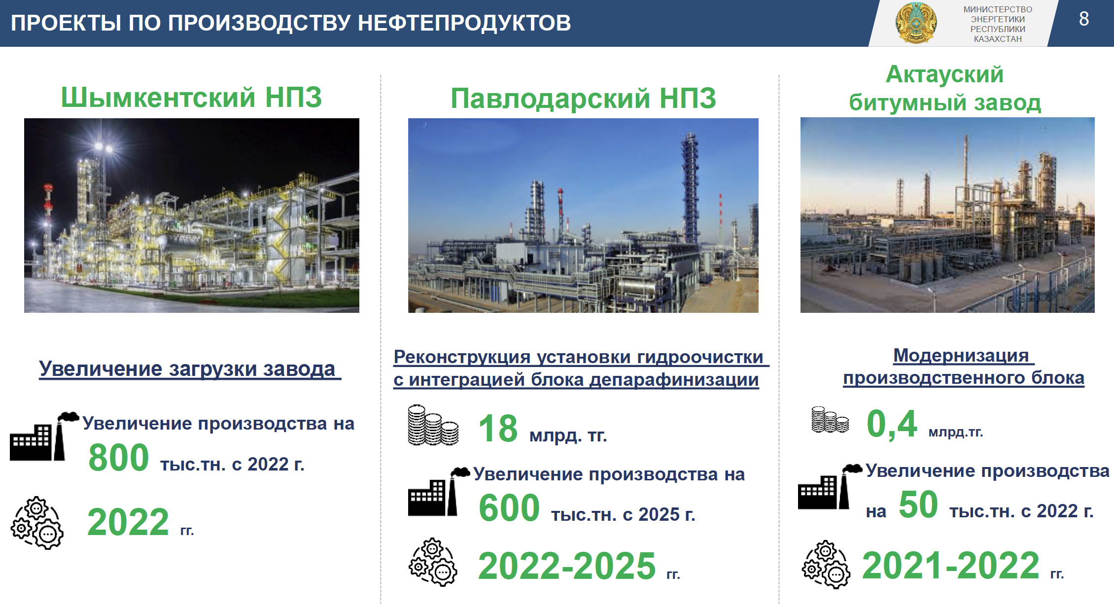 Согласно национальному энергетическому докладу KazEnergy в 2021 г., до 2050 года в Казахстане не будет дефицита по ГСМ, авиакеросину и дизелю. Иными словами, три НПЗ покроют весь внутренний спрос с увеличением переработки до 21 млн тонн в год с текущих 18.