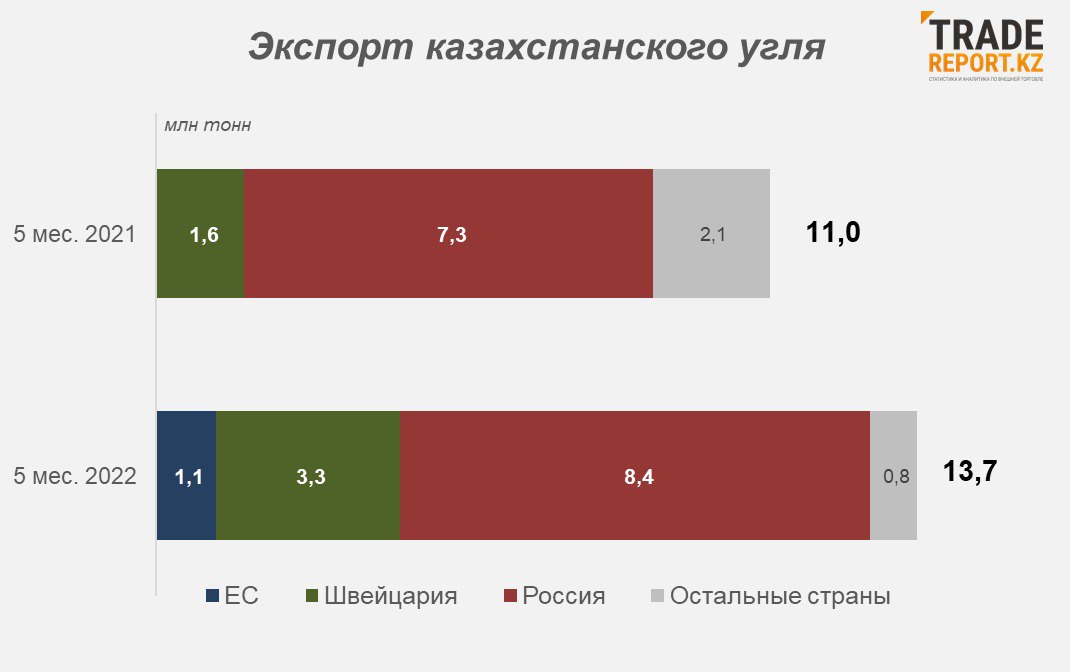 Основным импортером остается Россия: 8,4 млн т угля – на 15% больше, чем годом ранее. На втором месте Швейцария: 3,3 млн (рост более 2-х раз). На третьем месте оказались страны ЕС, которые резко сократили закуп у России в преддверии полного отказа от импорта всех видов российского угля. За 5 месяцев в ЕС было экспортировано 1,1 млн тонн казахстанского угля, тогда как в прошлогоднем периоде было всего 23 тыс. тонн.