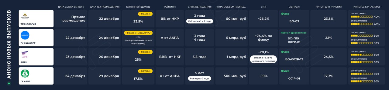 18 декабря 2025 года Сегежа проведет сбор заявок на выпуск биржевых облигаций 003P-08R и 003P-09R, а само размещение запланировано на 23 декабря 2025 года. Компании в феврале проходить оферту по 5-му выпуску на 10 млрд. руб и возможно начали подготовку к этому событию. Финансовая ситуация в компании остаётся примерно стабильной, что скорее плюс, с учётом крепкого рубля и экспортной ориентированности. Уменьшение процентных расходов и стабилизация денежного потока повышают способность обслуживать новые выпуски. Дальнейшее смягчение денежно-кредитной политики оживляет строительный сектор, спрос на пиломатериалы и бумагу для строительных мешков – ключевые производственные направления Сегежи.