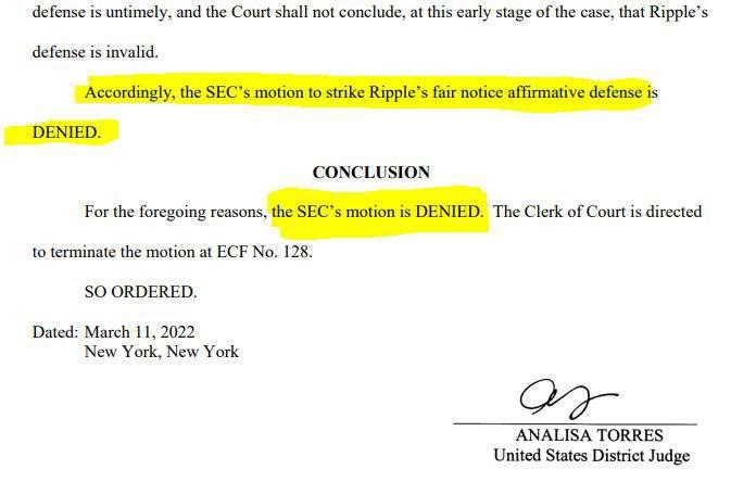 Сегодняшний приказ дает понять, что существует серьезный вопрос, предоставляла ли SEC Ripple справедливое уведомление о том, что продажа XRP с 2013 года когда-либо будет запрещено законом о ценных бумагах.