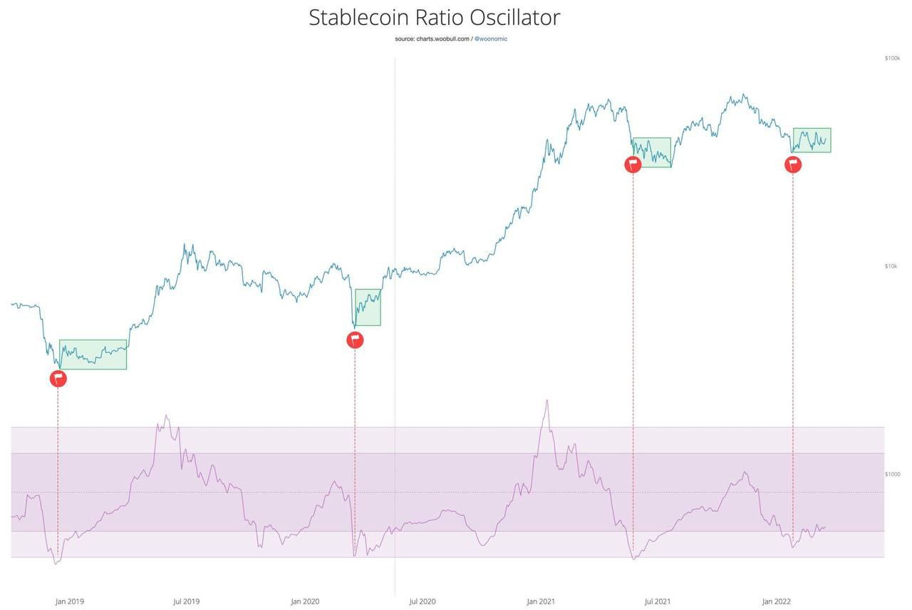 Когда SSR низкий — предложение стейблкоинов имеет больше покупательной способности для покупки BTC.