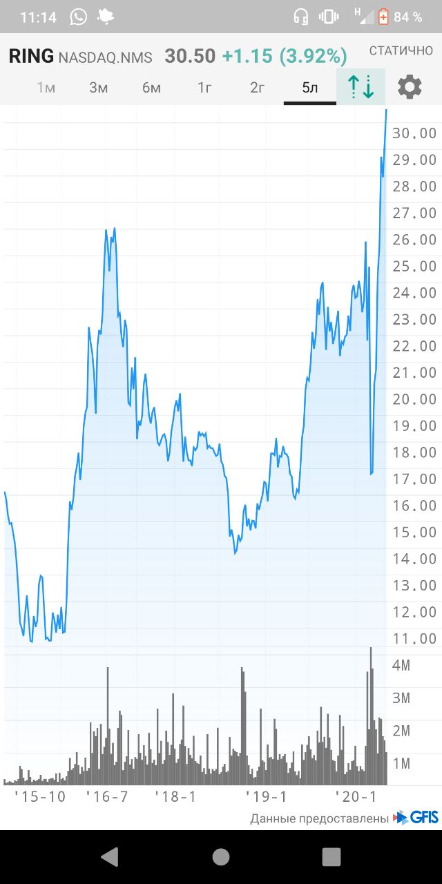 16 марта 2020 я писал, что по цене 15 USD купил ETF фонд, инвестирующий в акции золотодобывающих компаний. Вчера цена RING составила более 30 USD за одну акцию, и сработал отложенный ордер на продажу половины набранной ранее позиции. Зафиксирована доходность по сделке 100% в долларах за 2 месяца. Не нужно путать с общей доходностью по портфелю, так как RING был куплен лишь на часть свободных средств. Тем не менее к доходности за 2020 год одна эта сделка добавит осязаемую величину. Раскрывать её, я, конечно, не буду, ведь зная доходность сделки и влияние на доходность портфеля внимательный читатель без труда вычислит долю инструмента в портфеле. А этого я бы хотел избежать.