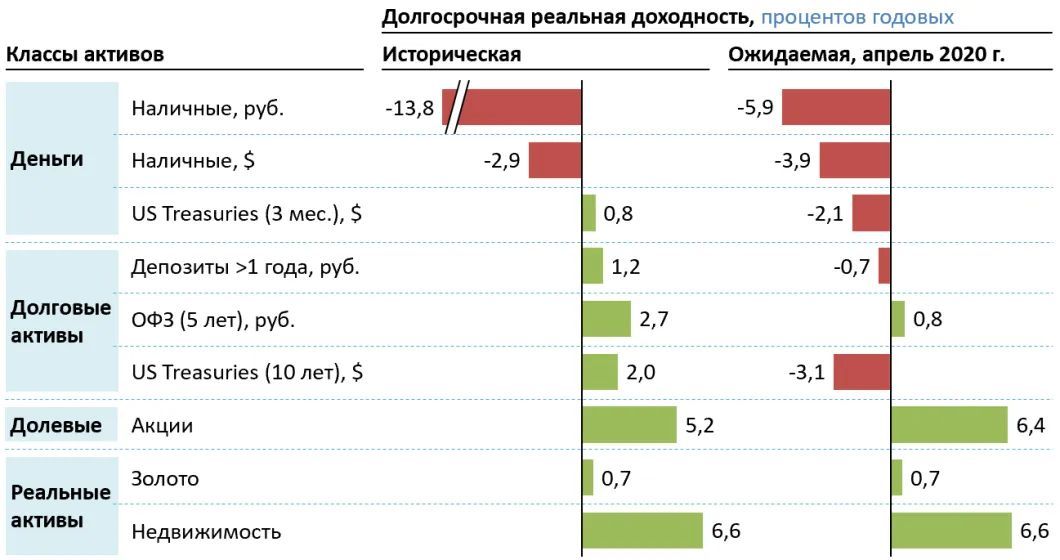 График долгосрочных реальных доходностей различных классов активов из стати Павла Комаровского привожу ниже.