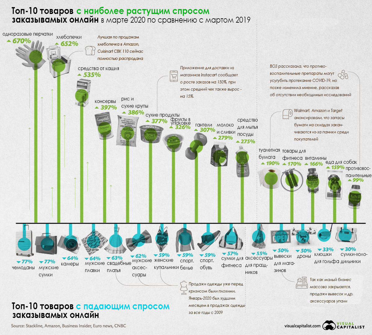 Онлайн-магазины с Amazon во главе сообщают о результатах продаж по категориям в марте, и эти данные впечатляют. Топ-10 товаров с растущим спросом (по отношению к марту-2019):