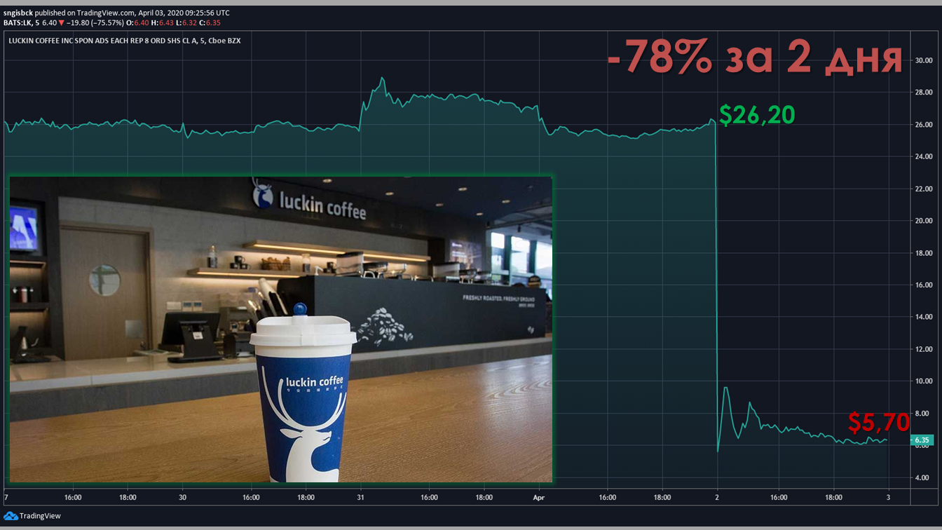 Акции китайской сети кофеен Luckin Coffee (это такая китайская копия широко известного Starbucks и их главный конкурент в Поднебесной) упали на 78% всего за два дня!