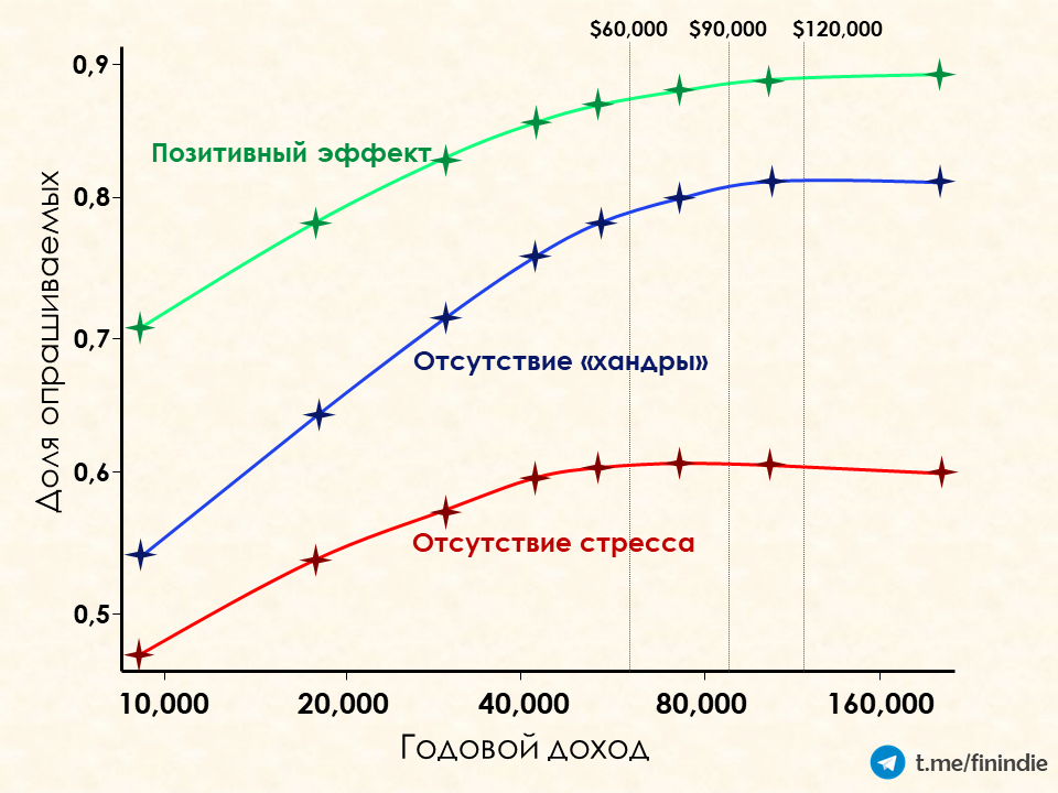 Я пишу так уверенно, потому что Дэниэл Канеман с Институтом Gallup в 2008-2009 провели большое исследование с выборкой аж целых 450,000 американцев с выявлением зависимости эмоционального благополучия от уровня дохода. Да-да, тот самый Канеман, получивший Нобелевку за эксперименты над людьми, описанные в его книге "Думай медленно - решай быстро" и в "Хулиномике" А. Маркова.