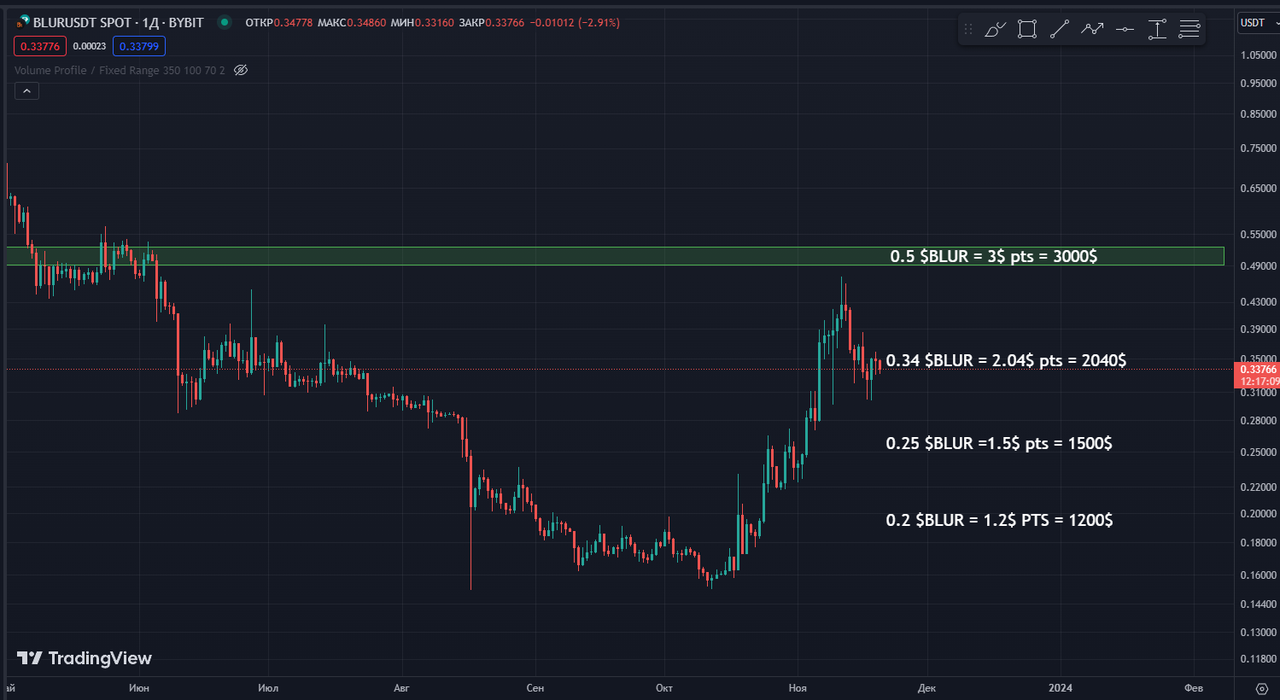 Размышлений на данную тему очень много, от 1-3$ за «PTS», но давайте продержимся популярной теории, которую обсуждают в сообществе BLUR. Комьюнити считает что «1 PTS = 6 $BLUR», но финальный профит напрямую зависит от цены токена, который находится сейчас на отметке $0.33. Естественно, у многих крупных фармеров дропа, уже всё заготовлено и они будут вливать весь полученый объем токена по стакану, тем самым проливая токен