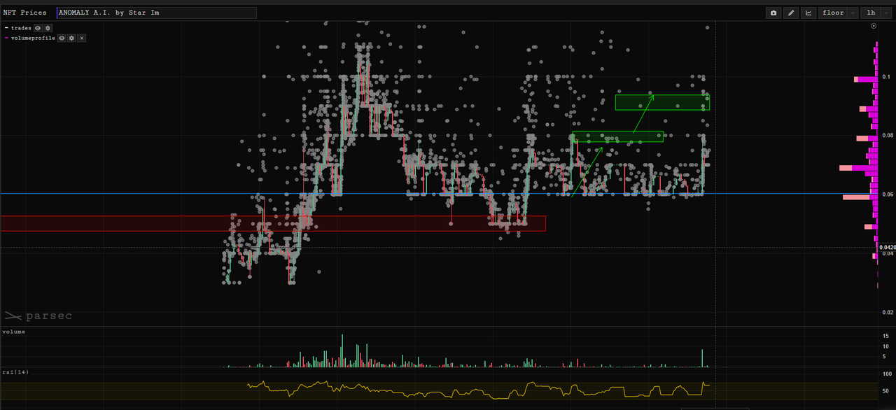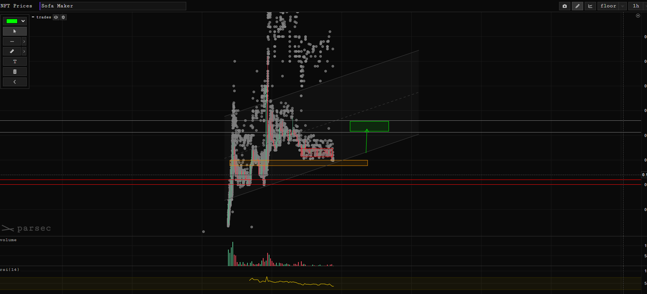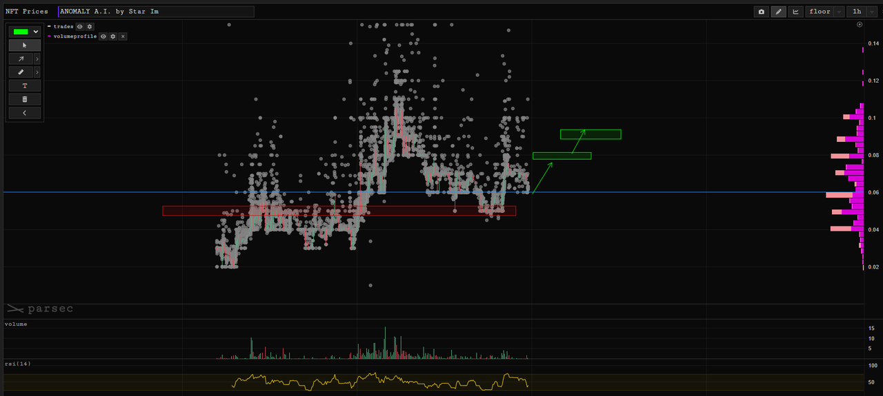 Активный арт-объект, но не попадал под наше внимание для коллов, сейчас хотим дать под небольшой риск, коллекция успешно отскочила от 0.05 до 0.08 и сейчас мы снова опустились до 0,06 , покупки продолжаются, стенки тонкие и при хорошем объеме можем снова дойти до 0.08-0.09 - там ближайшая остановка, потому что видим небольшое скопление листингов. Будьте аккуратны, и при плохом исходе, сокращайте потери.