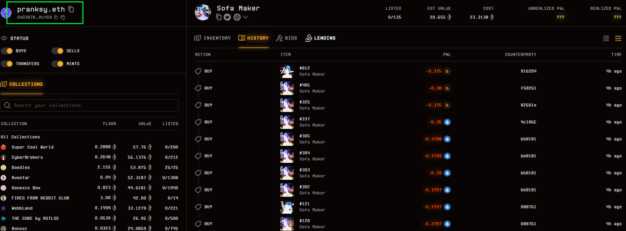 Пeрвые листинги появились по цене 2,5 eth, но активные покупки со стороны покупателей стали видны только после снижения цены > 2 eth. Тех, кто быстро решил забрать свои деньги, тем самым задампив флор, одним свипом забрал совершенно недавно созданный кошелёк. Наше мнение, что это был один из основателей проекта, для того чтобы удержать fp на данных значениях.