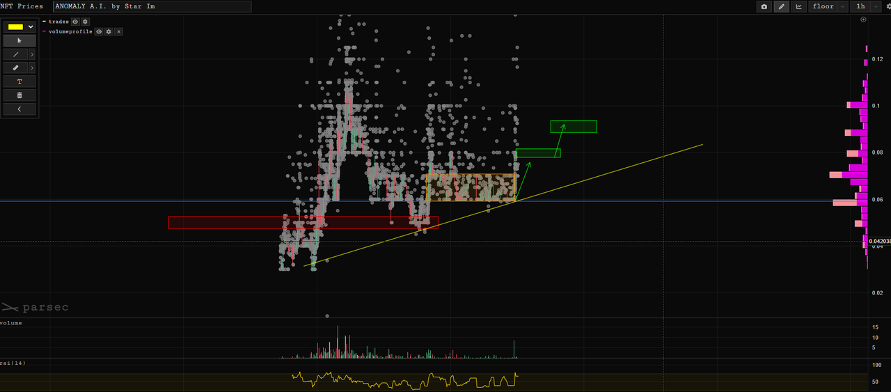 #AlphaCall 🖤 ANOMALY A.I. by Star Im Current price: 0.06 Entry: 0.055-0.06 TP1: 0.08 TP2: 0.09 Stop: 0.045-0,05 Listings: 1935 🟣🟣🟣⚪️⚪️ *риск Активный арт-объект, но не попадал под наше внимание для коллов, сейчас хотим дать под небольшой риск, коллекция…