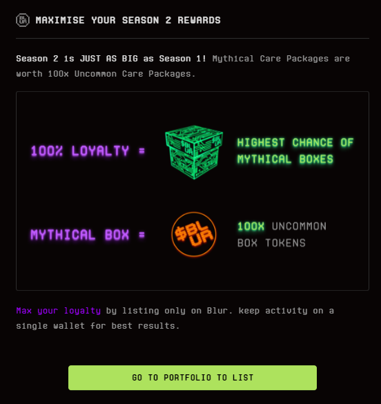 Дополнительные очки шли за LISTING: «Они будут такими же большими, как и BID» - по заявлению BLUR. Точная формула не разглашается и скорее всего при раздаче будет учитываться «LOYALTY» - вы должны были держать его на 100% - продавать и листить NFT только на их площадке, даже 1 NFT с листингом на Opensea, снижал вашу лояльность. Максимальная лояльность - дает больший шанс на выпадение «Mythical boxes», в котором лежит больше токенов.