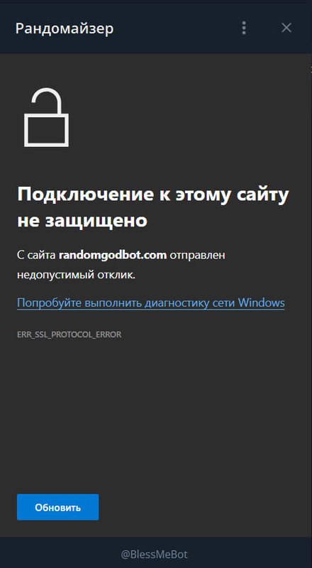 Да, мы обратили внимание и при прохождение на сайт бота с ПК возникает данная ошибка. Если вы сомневаетесь в подлинности сайта, то будьте спокойны, это просто бот для проведения розыгрышей - ссылка.