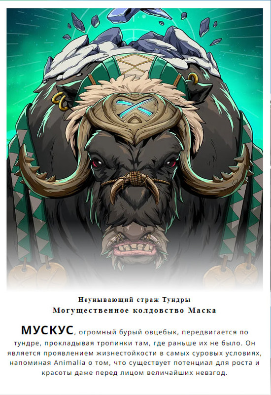 Animalia — независимая карточная онлайн игра F2P с использованием NFT. Коллекция минтилась 18 декабря за 0,038 eth. Полный саплай — 3888, на ревеле каждая pfp будет отличаться замысловатым дизайном, в центре которого - Нанук🐻 или Мускус 🐃