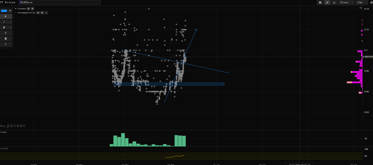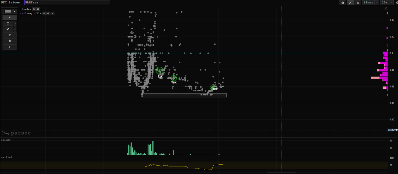 Коллекция, которая вчера заминтилась по прайсу 0.06 eth, что является довольно высокой ценой. Сейчас находится в тренде и имеет громкий шилл в твиттере. Ночью произошел PUMP до 0.13 и уже откатились до 0.09, немного отторговали движение и наблюдаем за объемами, возможен дальнейший откуп. Очень плотно вчера покупали диапазон 0.075-0.089, не думаем, что просто вернемся туда без какого либо движения вверх, но возможно всё, помним об этом!