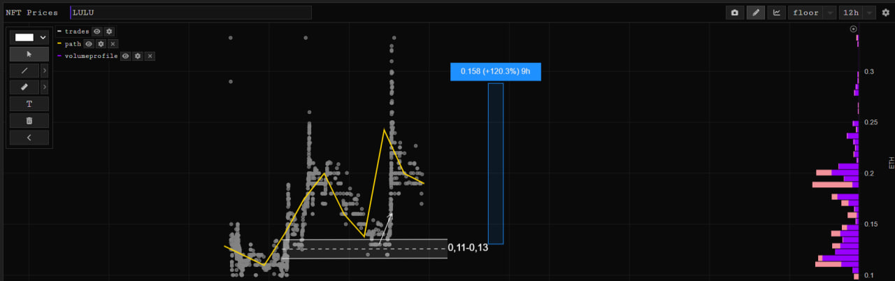 • LULU — все как надо. Полностью отработанная ситуация, в которой получилось словить хороший плюс — график. Ночью на свипах, покупки доходили до 0,23, но мы вышли лесенкой до 0,2. Общий + с 7 nft получился ~ 0.3 eth