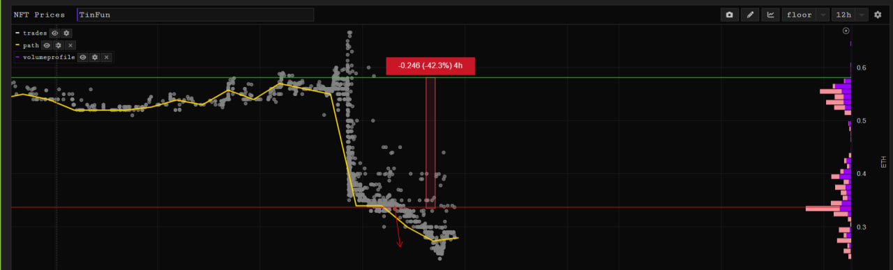 • TinFun — вчера состоялся ревел, на котором вышло немного флипнуть в +. Но после увеличения листингом в х6, бОльшое количество интересных трейтов стало никому не нужным. В итоге отторговали +- в 0 и теперь снайпим в свободное время рарити и несколько трейтов, которые хорошо покупают выше флора. Актив сейчас тут есть, но судя по анонсам за все время, коллекция держась только на ожидание о ревеле, поэтому не упускаем тот вариант, что можем уйти ещё ниже.