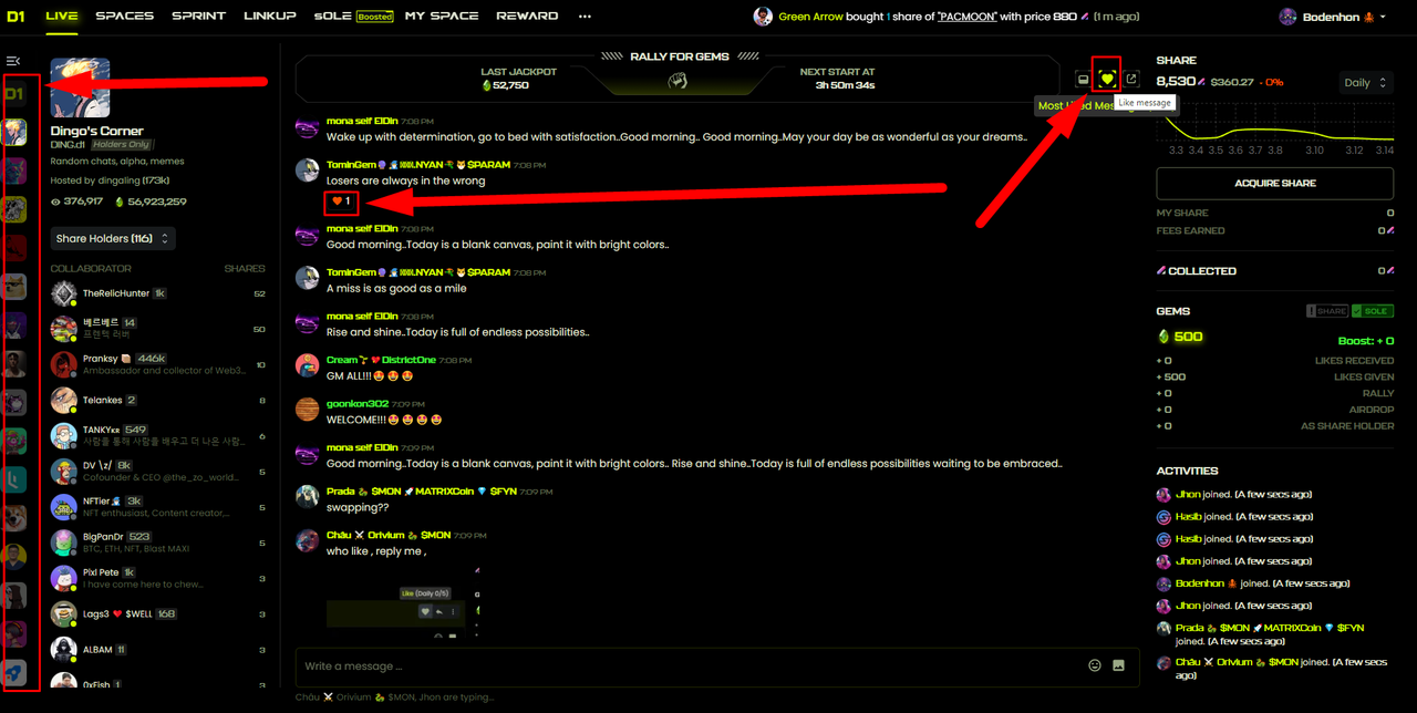 • Каждый день даются 5 ЛАЙКОВ и нам нужно их потратить на любые сообщения в течении дня в любой комнате - за это получаем 100 GEMS за 1 лайк [прикрепляем скрин как находить смс для лайков]